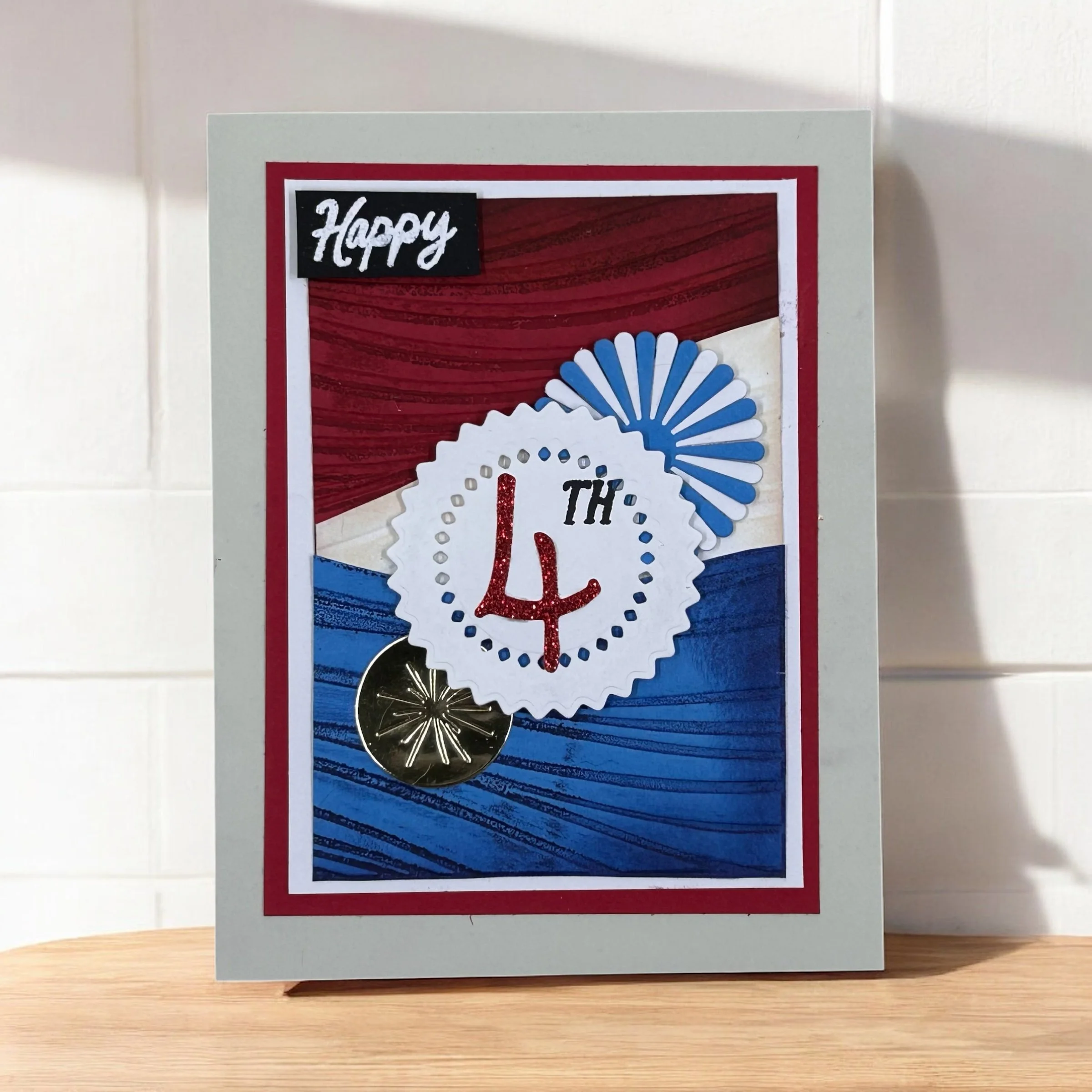 Die-cut a white scalloped circle using the die set from the Round We Go bundle, and stamp “4TH” in the center. I die cut and used red glitter paper for the number 4 and stamped the “TH” in memento black ink for contrast.